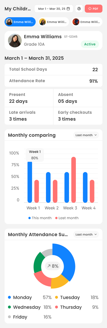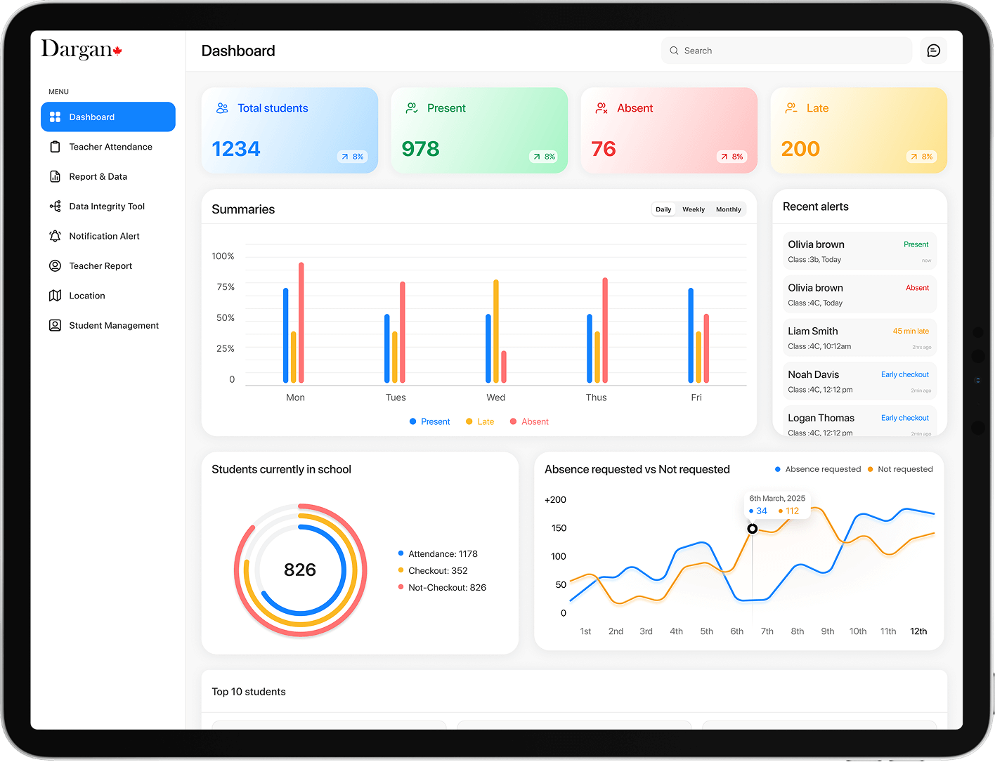 Get a real-time dashboard that integrates seamlessly with your school's systems. Monitor routes, get alerts, and manage attendance — all in one place.